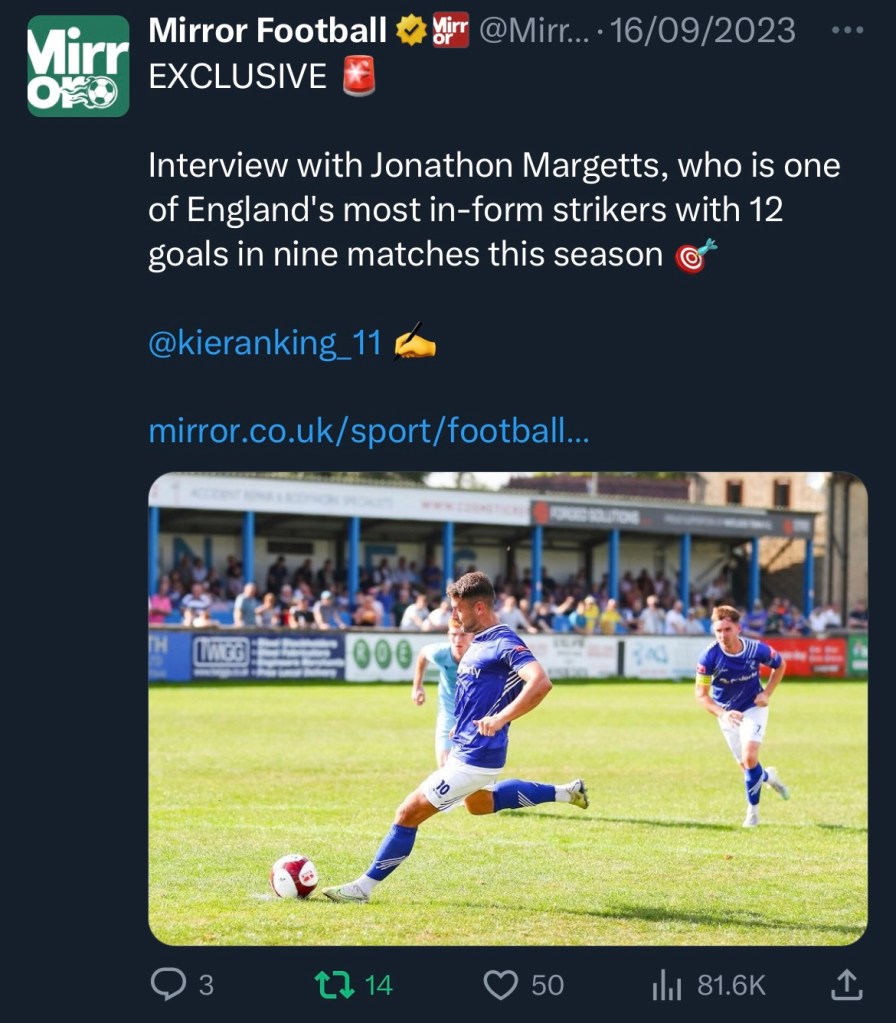 After becoming the top scorer in the top seven divisions of English football, I decided to speak to Jonathan Margetts of Matlock for an exclusive interview. I felt as though as we could create a strong headline and get good traffic from this piece, despite it being a non-league footballer. I spoke to Jonny on the phone for around 30 minutes, with 15 of those being on the record.