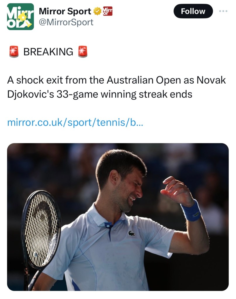 After winning 33 straight matches at the Australian Open, Novak Djokovic suffered a shock semi-final exit to Jannik Sinner during the 2024 tournament. Despite my limited knowledge on tennis, I was tasked on covering this story as a breaker and I relished doing something outside my comfort zone.
